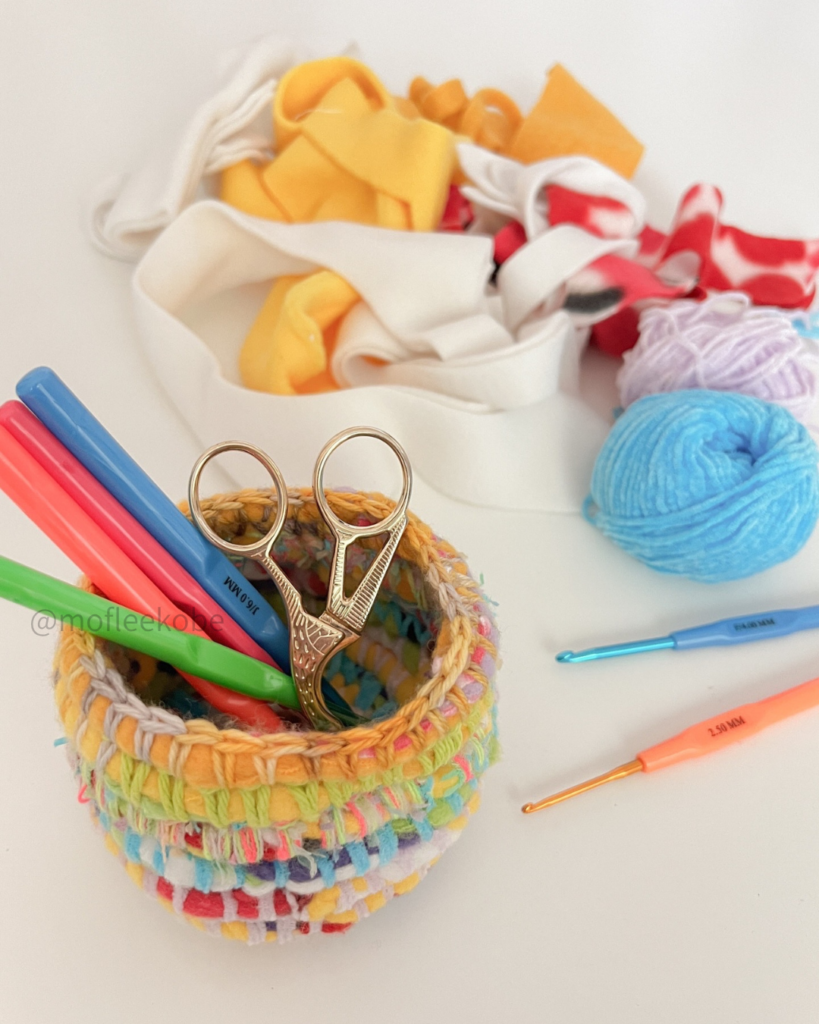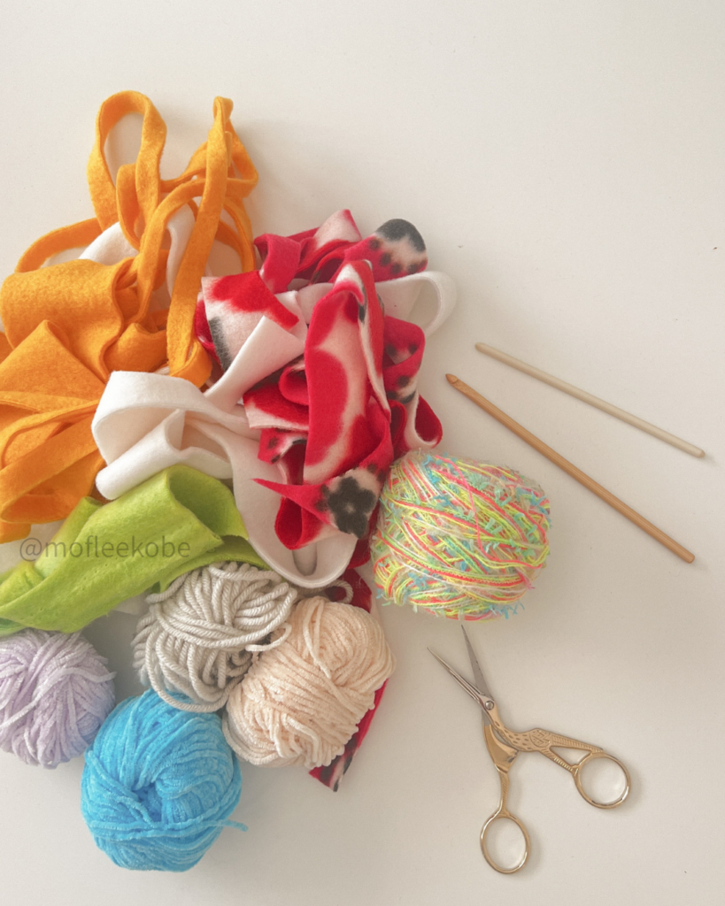 このモロッコかごを作る際に、モフリーの製作過程で出る「はしっこ」を芯材として使うと、